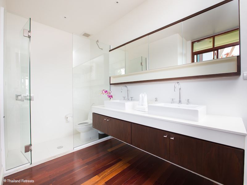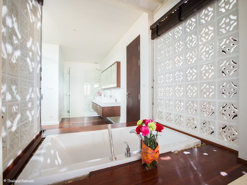 The villa is located just steps away from the sand of Ao Nam Mao beach. There is an outdoor covered patio and a sun deck with chairs around the 43 sq.m.private pool, which features an infinity edge and Jacuzzi bench. The garden stretches the full length of the wide 200m beachfront. A larger communal pool is also available within the development for those who wish to swim laps.