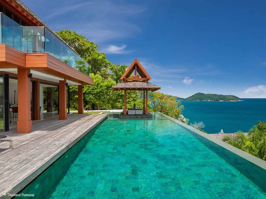 Baan Santisuk is an amazing 5 bedroom Phuket villa perched on a headland between two beaches. Has 2 sundecks and a fully equipped health and fitness centre, table tennis table and cinema.