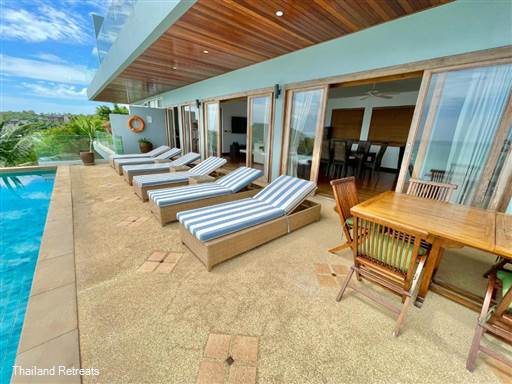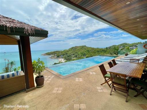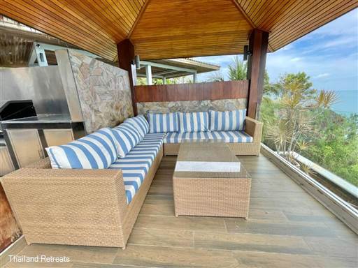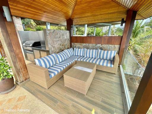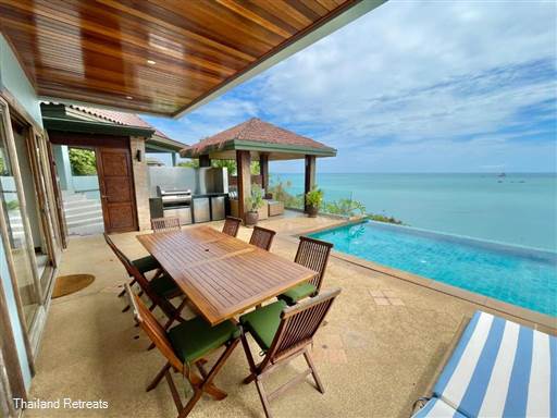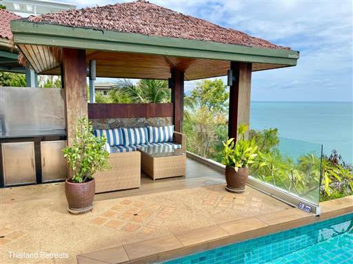 The spacious sun terrace offers sun loungers with lavish soft cushioning and outdoor dining table looking over the 40 sqm infinity swimming pool towards the stunning views. A shady pool-side sala pavilion is the just the place to escape the sun and enjoy the cooling ocean breeze with a chilled refreshment. The built-in gas BBQ is perfect for preparing an evening BBQ and enjoying freshly cooked seafood from the nearby fresh market in Bangrak.