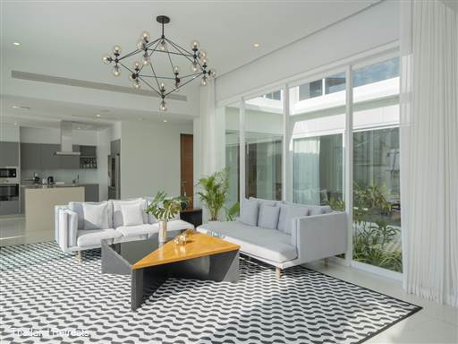 Upon entering your villa, you'll be greeted by a bright and airy all-white living room that beautifully complements the modern aesthetic. The space is adorned with asymmetrical accents and minimal ornamentation, creating a relaxed yet sophisticated atmosphere. The open-plan layout seamlessly connects the living area to the dining space, which features a rectangular table that comfortably seats up to 10 guests. This design encourages conviviality, making it an ideal setting for shared meals, whether indoors or al fresco by the pool, facing the ocean.