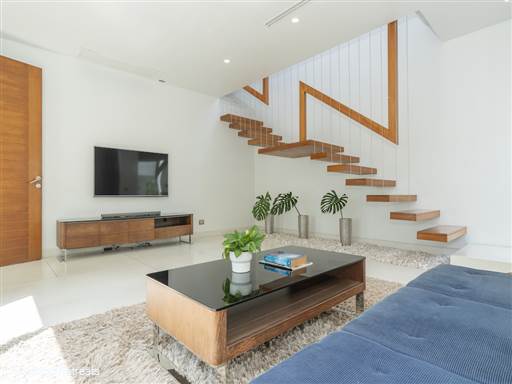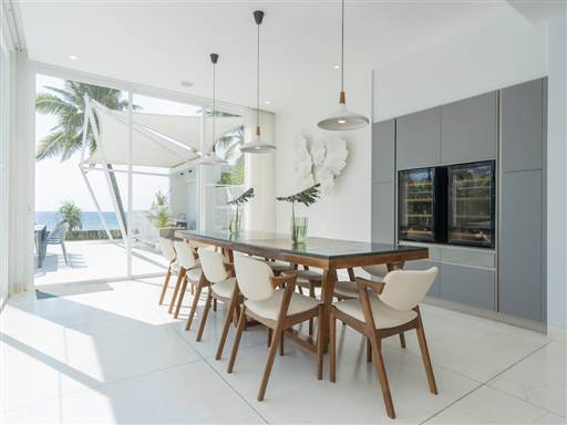 You’ll be greeted by bright, airy living spaces that enhance the modern aesthetic. The open plan seamlessly connects generous living areas to dining spaces that comfortably seat up to 20 guests, promoting conviviality for shared meals, whether indoors or al fresco by the infinity pool overlooking the ocean.