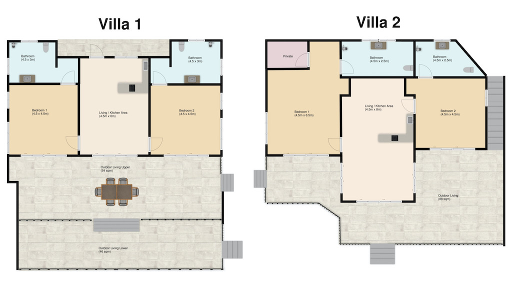 The villas can be arranged as either a principle four bedroom, four bathroom villa or as two separate two bedroom, two bathroom villas with both villas have fully furnished living rooms and kitchens.