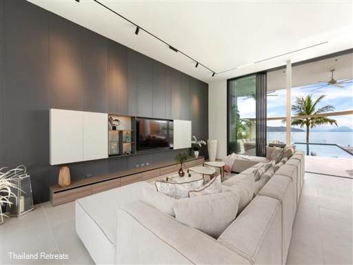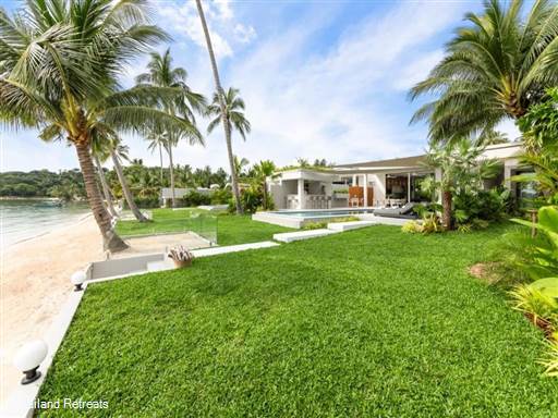 Emotion Beachfront Villa 1 is a 5 bedroom luxury villa set right on the beach in Thong Krut bay located on the south west coast of Koh Samui. One of 4 identical beachfront villas, the villa features an oceanfront private pool surrounded by lawned gardens and enjoys stunning views of the nearby islands. The 5 luxurious bedroom suites sleeping 10 persons is perfect for that family getaway or to chill out with a group of friends.