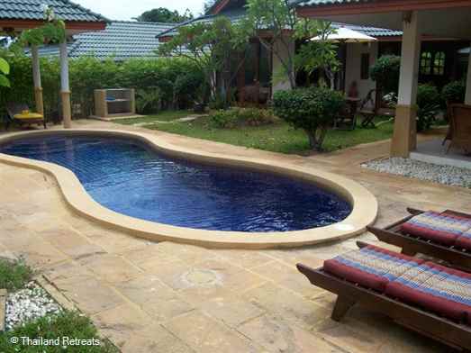 The private kidney shaped pool is surrounded by a paved deck furnished with a patio table and chairs, sun loungers and shade umbrellas. Sun loungers are also provided for guests to use on the beach.