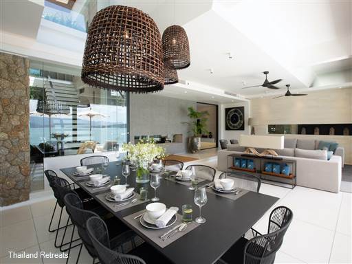 The outdoor areas are designed for relaxed beachfront living, with expansive infinity pools overlooking the sea and generous lounge spaces furnished with sun loungers and shaded seating. Whether enjoying long sunny afternoons by the pool or cooling off with a swim, the setting encourages complete relaxation and quality time with loved ones.