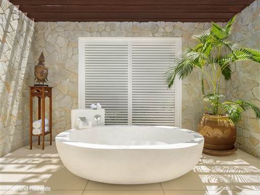 Above the main living space are three of the six double bedrooms, including one master suite with a private terrace and views over two of the island's coasts. The suite can be fully opened on two sides should you prefer to sleep with the night's breeze instead of the A/C. The suite's en-suite bathroom leads onto its own private courtyard with a huge terrazzo bathtub set amongst the palm trees. The suite also has its own plasma screen TV with surround sound speakers and DVD player.
