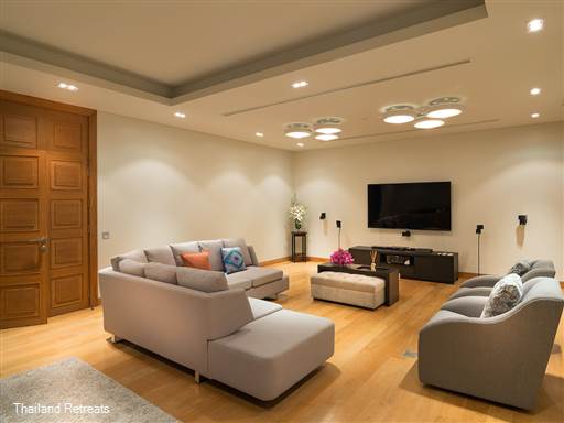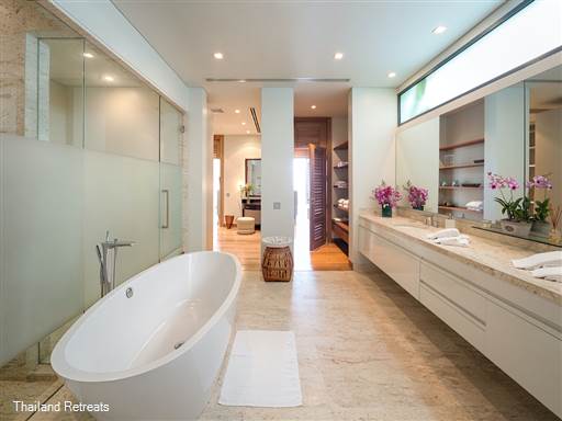 Elegant and graceful, the villa’s peak-roofed pavilions are inspired by traditional Thai architecture and its modern interiors are swathed in cool marble, with polished wood accents. Generous indoor and outdoor living areas are set over two floors connected by a lift and staircase.