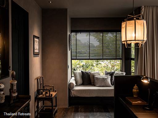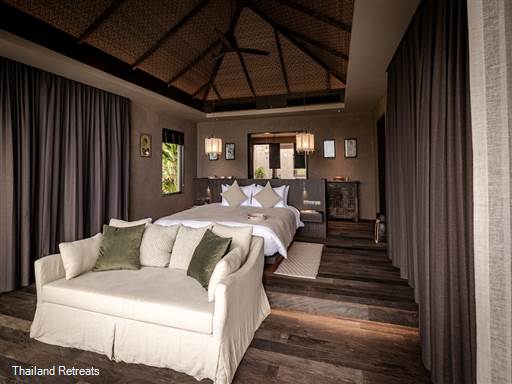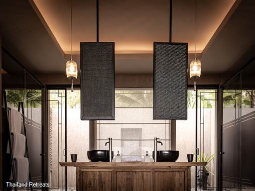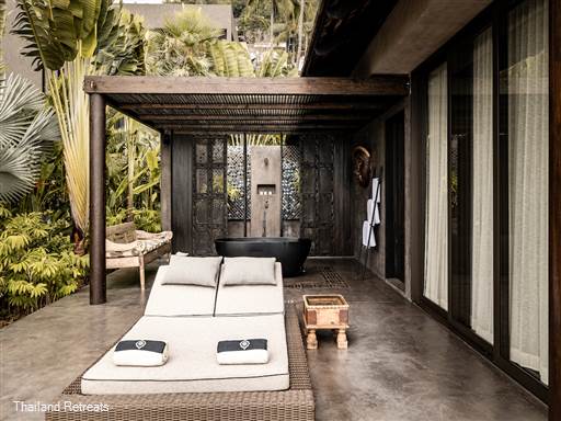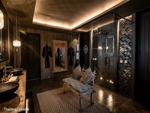 Deluxe Standard Villas - Samsara, Tonka. Mahora and Liu and Standard Villas -Jicky, Nahema, Idylle & Chamade are 360 sqm retreats feature spacious living areas, elegantly designed bedrooms, and modern bathrooms with premium amenities. The decor masterfully blends contemporary style with Thai influences, providing an inviting atmosphere perfect for relaxation. Each villa also includes a personal terrace for tranquil outdoor enjoyment.