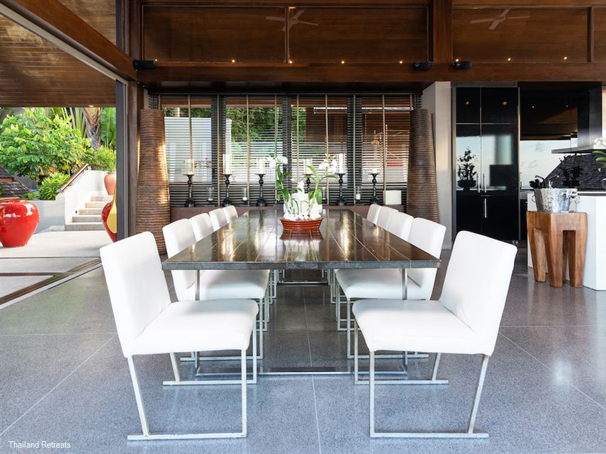Finally, steps lead back up onto the wide balcony and to the lounge, kitchen and dining area. This is a very large property that has been beautifully designed to provide both private and practical accommodation that's suitable for large families or groups of friends. The flexibility of the villa also makes it an ideal choice for weddings and events.