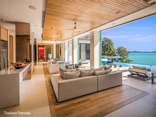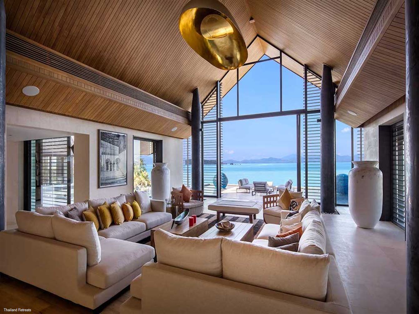 Walkways lead over water to a modern interpretation of a Thai gabled-roof entrance, hinting that this is a villa that exudes a sense of creativity, fun, and grandeur. Interiors are hugely spacious to really expand the sense of connection with the outdoors while full-length windows, sliding glass doors, and oversized panes at every turn frame the picturesque Andaman Sea.
