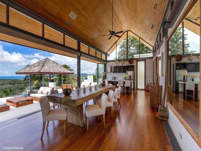 The master suite rests at the highest point of the villa and has a private furnished terrace. Encased on three sides by floor-to-ceiling windows, the room boasts panoramic views of Surin and Bang Tao Bays.