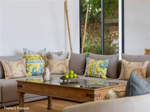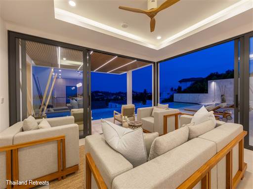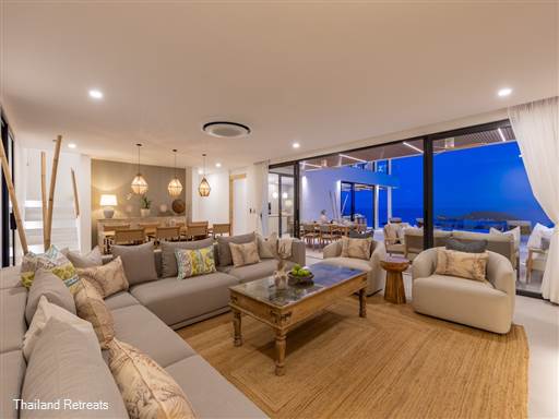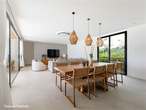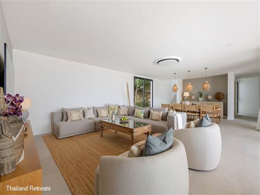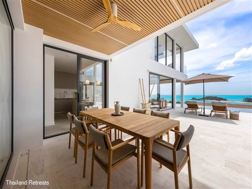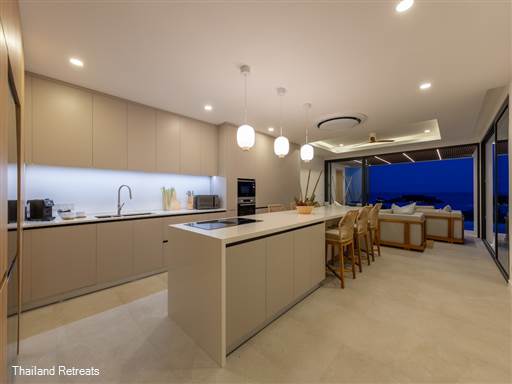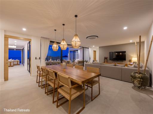 On one side of the main living area is the separated kitchen which has a long table and high backed seating for casual dining as well as a sofa set towards the front to sit and enjoy the views. As with the living area, floor to ceiling sliding doors open straight on to a covered area of the pool terrace offering great views.