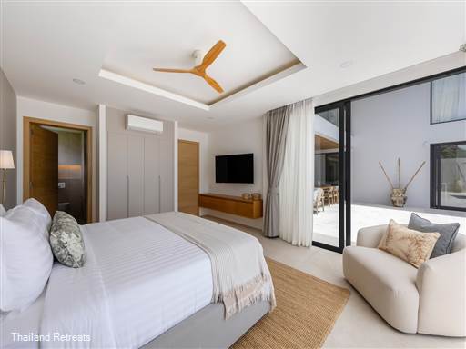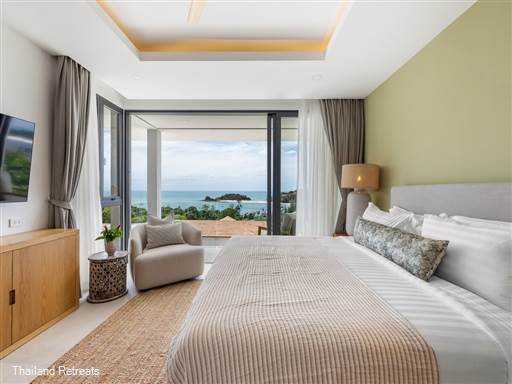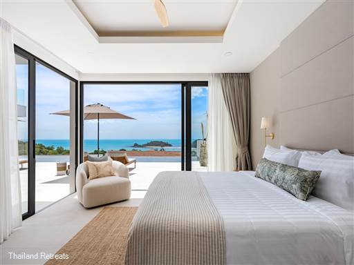 On the other side of the main living area is one of the 3 ensuite bedrooms offering the same sea views and offering the convenience of stepping out of your bedroom right on to the pool terrace.