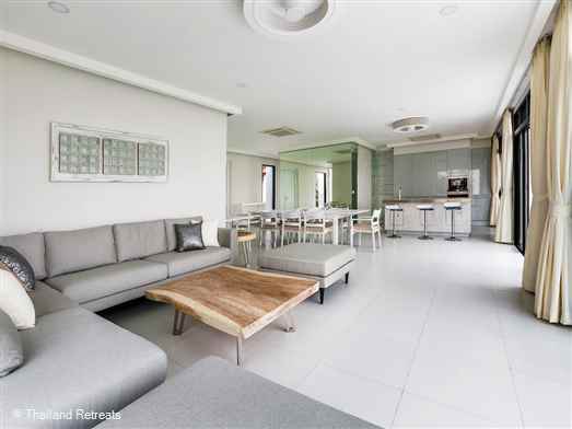 The living area has floor to ceiling slide back doors leading out to the pool and terrace, to a front baclcony and from the kitchen area out to the al fresco dining area.