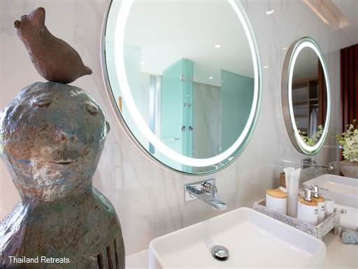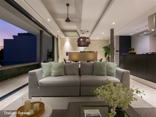 The expansive open-plan living area welcomes you with a bright atmosphere, showcasing imported European furnishings and state-of-the-art appliances. The fully equipped kitchen invites culinary exploration and opens up to a large terrace, which is perfect for dining al fresco while taking in the stunning views of the infinity swimming pool and the sea beyond, including views of the famous Big Buddha.