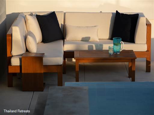 Guests at Villa Muscat will find ample opportunities for relaxation and recreation. The outdoor infinity pool overlooks the ocean and is accompanied by a spacious lounge area furnished with oak sun loungers, creating an inviting space to soak up the sun. For those who prefer to unwind in the privacy of their villa, a cozy seating area in the master suite includes a queen-sized pull-out couch, accommodating up to 6 adults or 8 guests when including children.