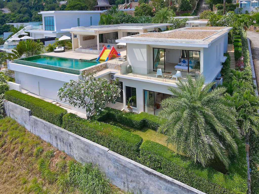 Villa Turquoise 1 is a stunning 4/5 bedroom luxury ocean view contemporary design Koh Samui villa with stunning ocean views. Located midway between popular Chaweng beach and Choeng Mon beach the villa features a waterslide, sauna, cinema room and hot tub