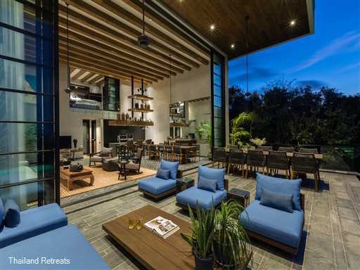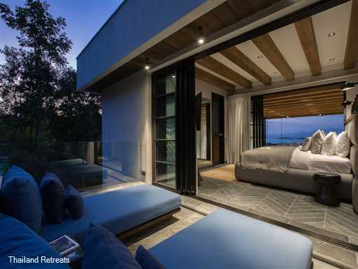 The main Villa is arranged over two foors with 400 square metres of total living space, houses the uniquely designed, open-plan 150 square metre lounge with impressive six-metre-high teak- beamed ceilings. The entire width of the house incorporates a grand open-plan living area including the kitchen, dining and sumptuous lounge area, and is fronted by foor to ceiling sliding glass doors leading onto the magnifcent terrace and vista. The grey marble and limestone terrace features an impressive 14 by 3.5-metre infnity pool, inlaid with the same grey marble limestone and complete with jacuzzi jets and in-water seating, and truly appreciating the seductive sea views over Koh Phangan. The hardwood exterior furniture comprises sunbeds, sofa sets and a dining table for up to 12 guests.