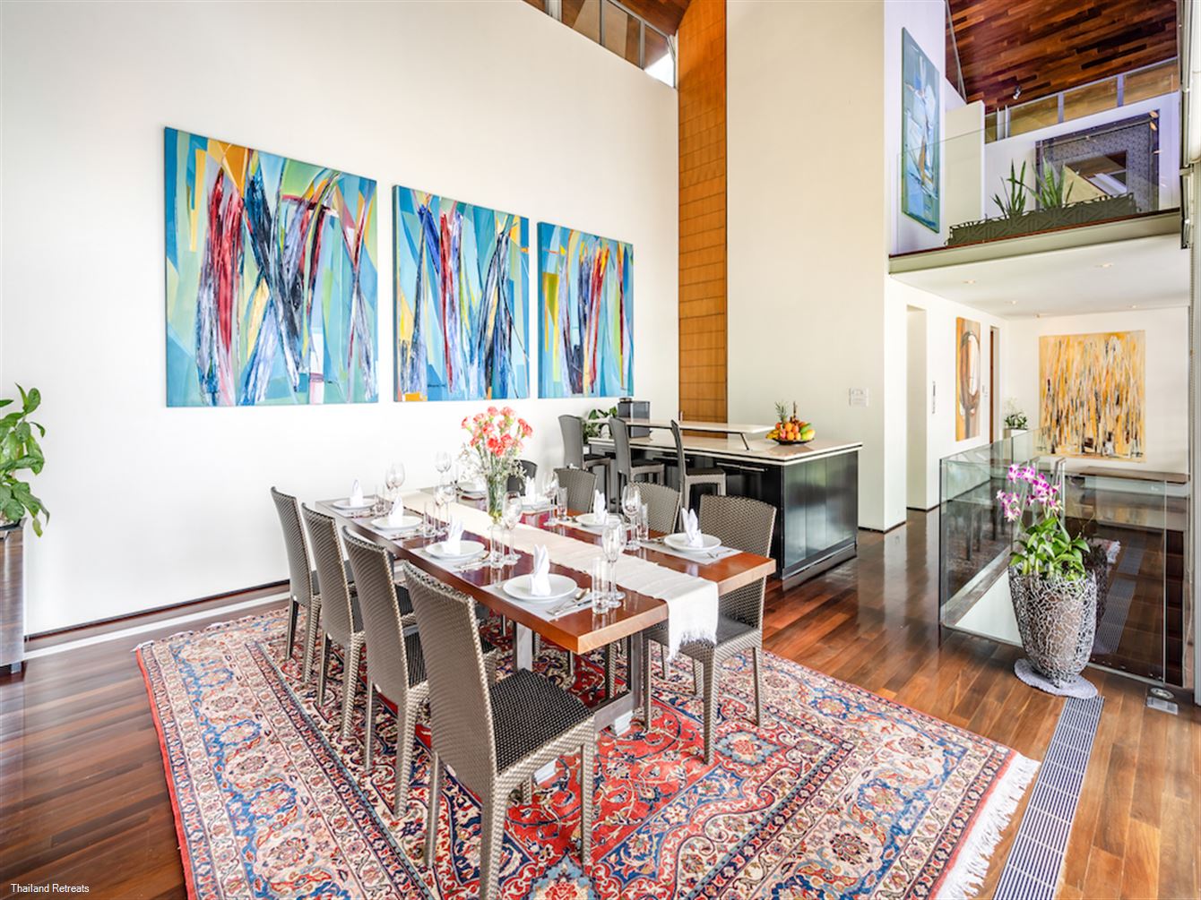 Back inside the villa, a spacious dining area sits under an airy double-height atrium, with a breakfast counter for casual snacks and an enclosed fully fitted kitchen hidden off to one side. Colorful abstract paintings adorn the walls, while dark wood floors and richly toned furnishings bring a sense of sophisticated tropical luxury to the rooms. Tucked away at the far end of the villa, a welcoming, carpeted library room offers a quiet, relaxed space to catch up on some holiday reading.