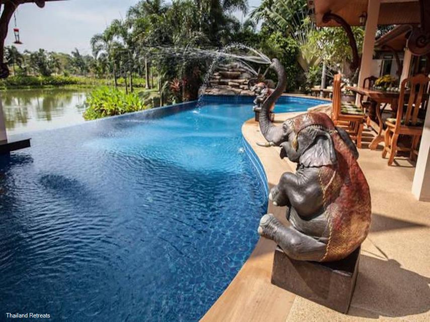 Villa Saifon's 19m infinity pool with a tropical waterfall feature is most likely the biggest private pool in the area. It has 3 in-water bar stools against a counter bar positioned along the edge of the sala. There is also a pool side shower and outside washroom.