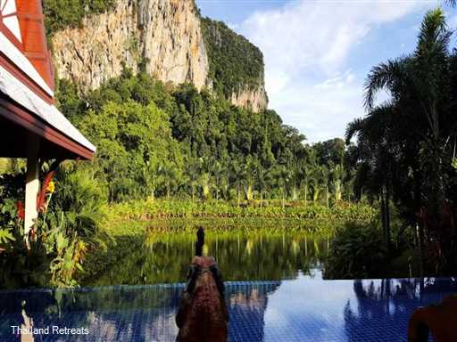 Villa Saifon 1 is a large, modern Thai style, three bedroom pool Villa with a 19m swimming pool ovelooking a private lake and with a stunning backdrop of Krabi's signature limestone mountains.