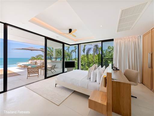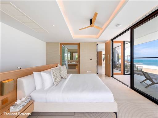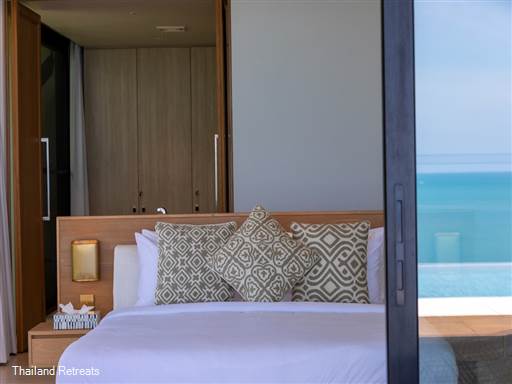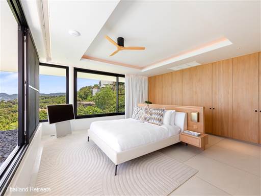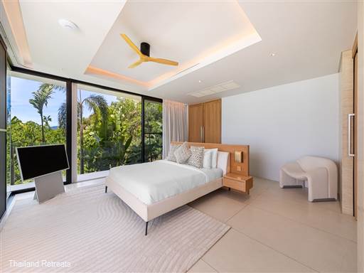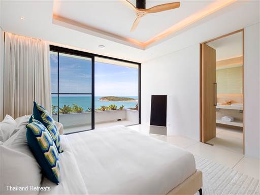 Villa Sutra features four spacious double bedrooms accommodating up to eight guests. Each bedroom includes a king-size bed, air conditioning, Smart TV, wardrobe space, and an en-suite bathroom. The master bedroom on the main level enjoys direct pool access and stunning sea views, with an en-suite bathroom featuring both a rain shower and bathtub, plus a walk-in wardrobe. The second master bedroom on the upper level offers sea and garden views with an en-suite bathroom including a bathtub and shower. Two additional guest bedrooms on the lower levels each feature king-size beds, en-suite bathrooms with rain showers, and private terraces overlooking the gardens.