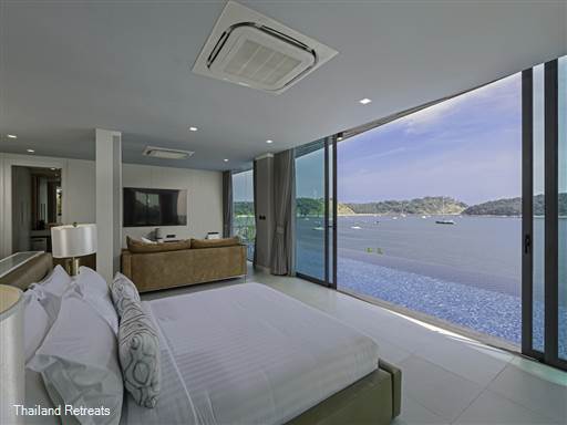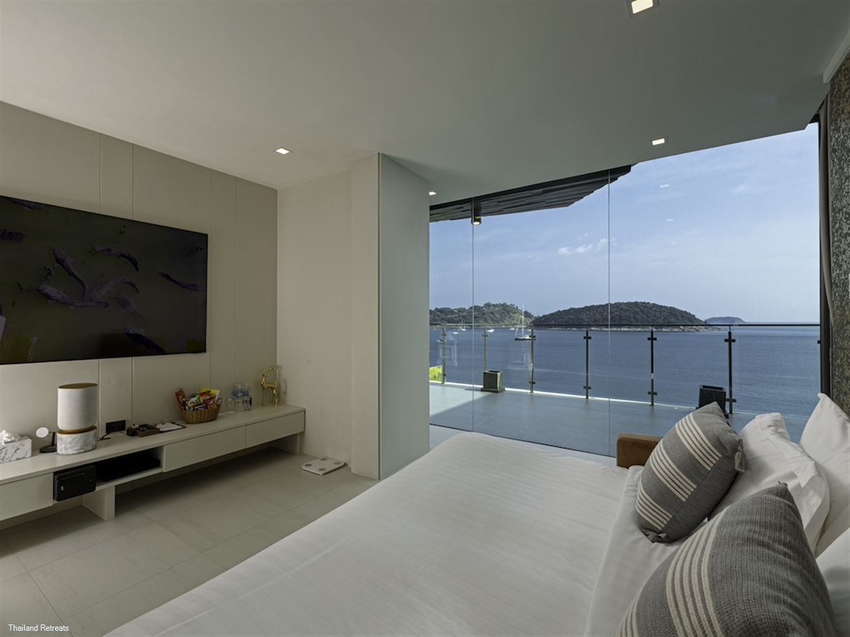 The outdoor living spaces are designed to maximise enjoyment of the stunning natural surroundings. The 30-metre infinity pool is the centrepiece, offering spectacular views over Nai Harn Beach and providing a perfect spot for swimming or lounging. Sun loungers around the pool offer comfortable spots for soaking up the sun or relaxing with a good book.